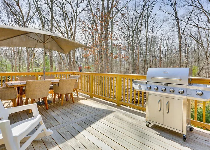 Positioned in the enchanting landscapes of East Stroudsburg, Pocono Tree-Lined Retreat With Fire Pit! Offers a unique escape that marries luxury with the serenity of nature. Just a 75 km drive from Lehigh Valley, this hidden gem invites you to unwind while surrounded by lush greenery and a tranquil atmosphere.